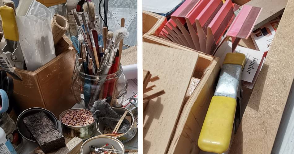 Le travail de conception-construction venait ensuite. Il confectionnait souvent quelques gabarits en carton pour lui éviter de refaire tous les calculs en cours de route, pour prévisualiser ses réalisations et guider ses coupes de bois à la scie circulaire. Venaient ensuite les phases d'assemblage, de collage, de décoration et de mise en valeur par divers accessoires créés de toutes pièces.